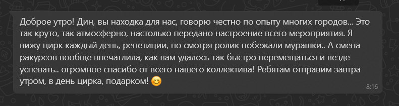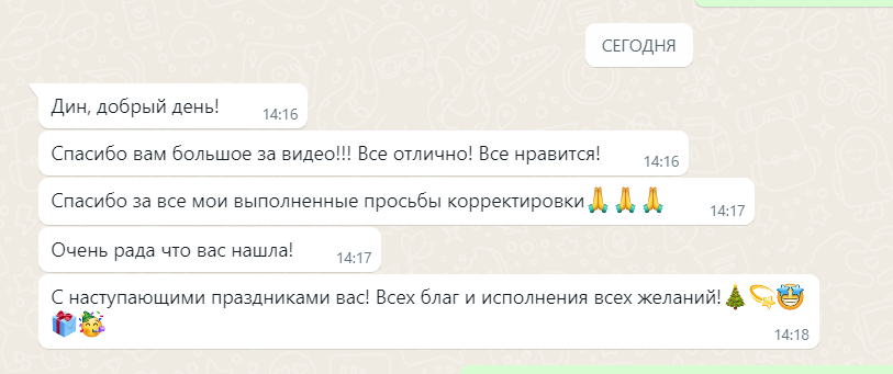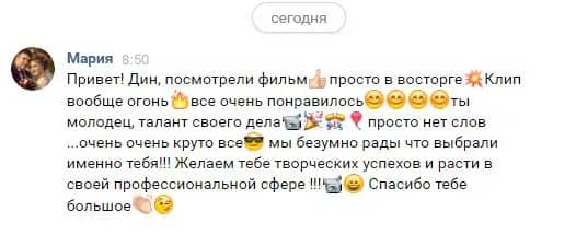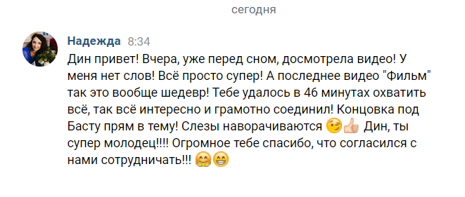Дин,огромное спасибо за прекрасное видео,за клип и за общее ,я не ожидала ,что будет на столько хорошо,вы большой молодец,я ни на секунду не разочаровалась в выборе,вы учли все наши пожелания ,и самое главное ,что как человек вы очень милый,спасибо огромное за вашу помощь и внимательность,а мой муж считает ,что у вас большое будущее,мы непременно встретимся с вами на других торжествах!!!!! Спасибо,спасибо,спасибо!!!!