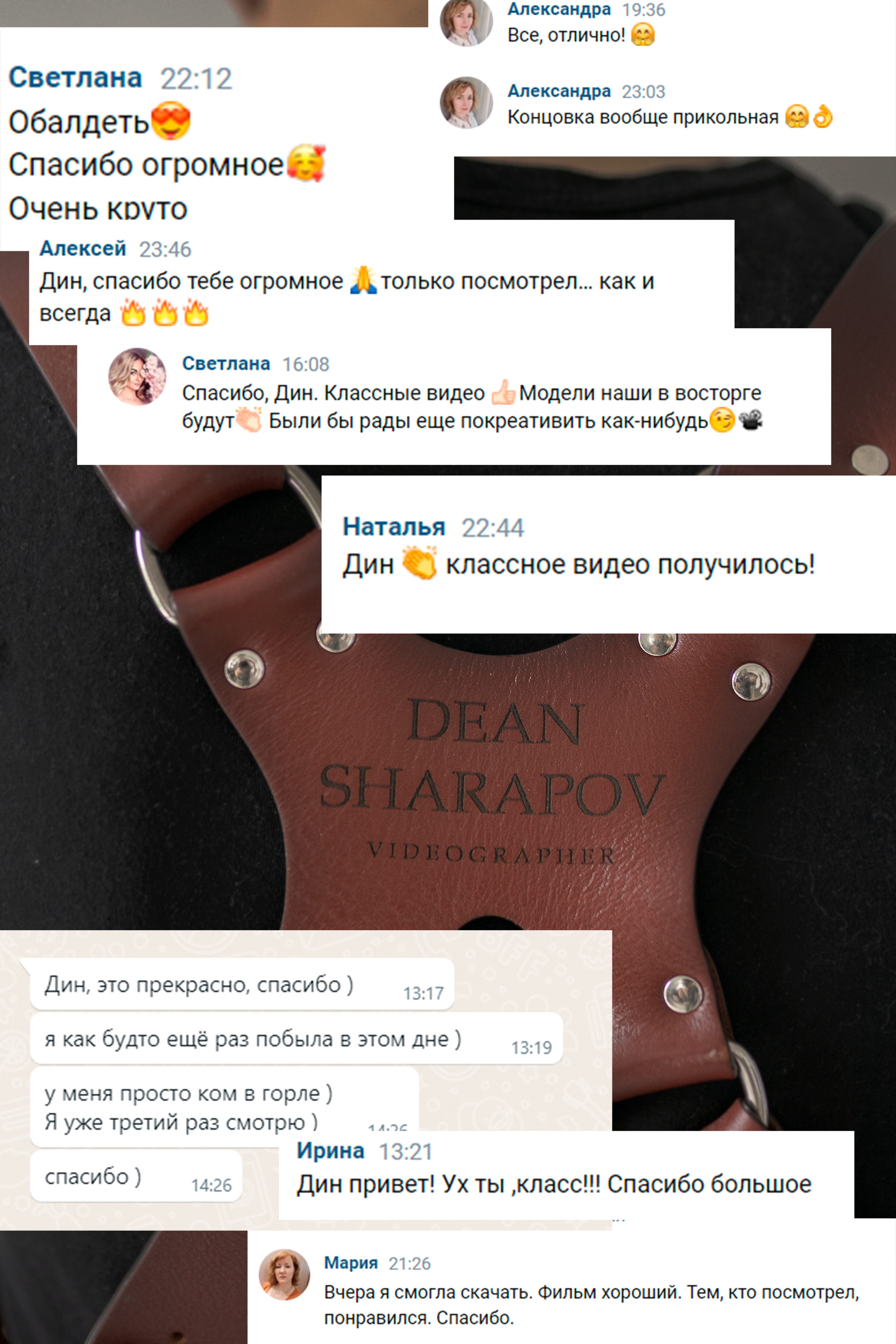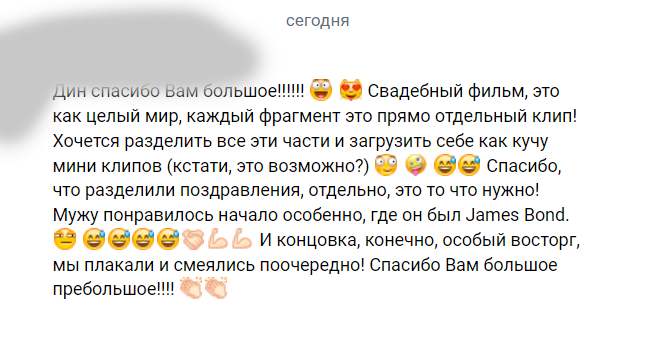 Насчёт фильма и клипа и тизера, Артём в восторге!)))) Сегодня посмотрели фильм и клип. Я вся слезами облилась в хорошем смысле слова и смеялись оба от счастья)) Настолько близко ты передал все наше настроение и атмосферу происходящего вокруг, все моменты идеально вписались и останутся на память. Классная музыка)) Я себе очень нравлюсь в видео, не ожидала что буду себе нравится и выглядеть так красиво )) Насколько важно все таки было запечатлеть все эти моменты, столько вложенных сил и сейчас я понимаю что все было не напрасно) Наверное такие эмоции испытываешь только тогда, когда смотришь свой собственный фильм ) У тебя очень здорово получилось собрать весь день во что-то единое и гармоничное и запоминающееся)) Даже не знаю, как возможно и реально вообще передать тебе все слова благодарности и восторг от просмотра, но ты меня поймёшь. Дин, то что мы увидели - офигенно!!! Спасибо тебе за то что был с нами и создал такую память о нашем дне)))