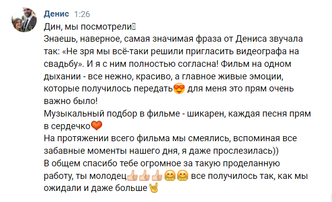 Знаешь, наверное, самая значимая фраза от Дениса звучала так: «Не зря мы всё-таки решили пригласить видеографа на свадьбу». И я с ним полностью согласна! Фильм на одном дыхании - все нежно, красиво, а главное живые эмоции, которые получилось передать для меня это прям очень важно было! Музыкальный подбор в фильме - шикарен, каждая песня прям в сердечко