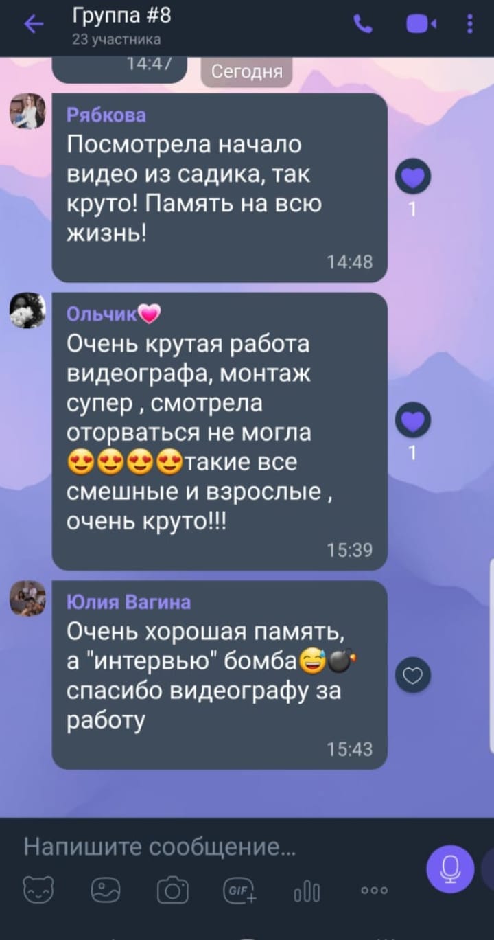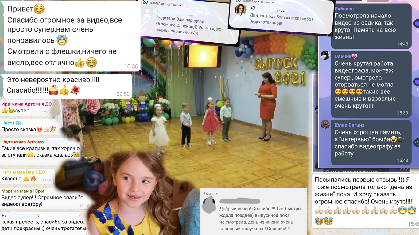 Воспитатели отметили вашу доброту и внимание, детишки с легкостью раскрывали себя перед камерой, а родители в результате получили очень красивые фото и трогательный фильм, которые хочется смотреть и смотреть... Эти видео останется нам на долгу память о прекрасных моментах беззаботной жизни наших дорогих малышей))) Все моменты учтены, снято и смонтировано все просто здорово, очень профессионально, а главное... ооочень душевно и трогательно!С радостью передаю ваши контакты следующем группам детишек, так что наш детский сад ждет вас!!!